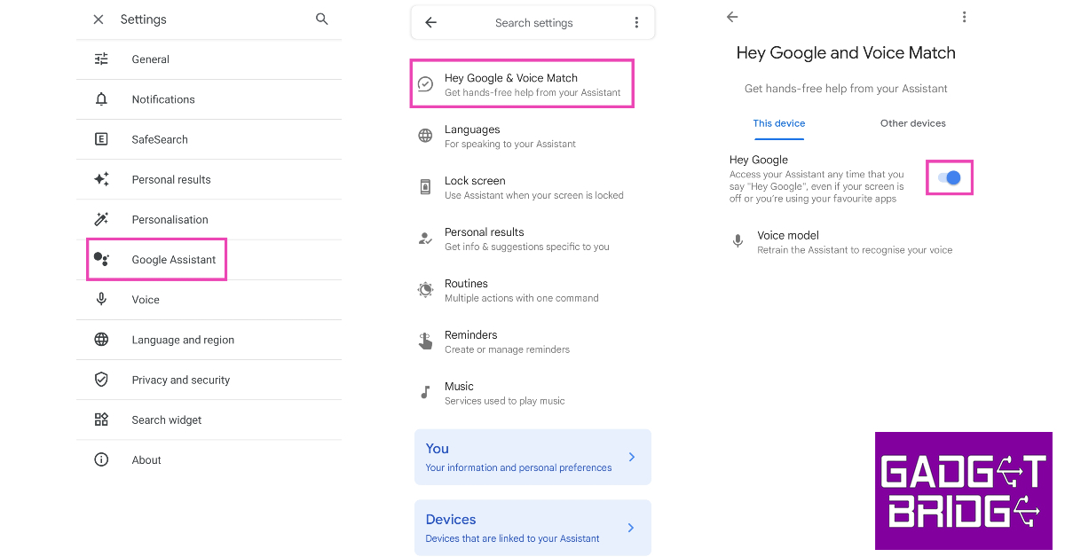 Para começar, você precisa ativar o Google Assistant no seu smartphone. Vá paraGoogle app>Configurações>Google Assistente>Ok Google e Voice Matche ative a barra de alternância para Ok Google. Agora, você poderá acionar o Google Assistente simplesmente dizendo ‘Ok Google’.