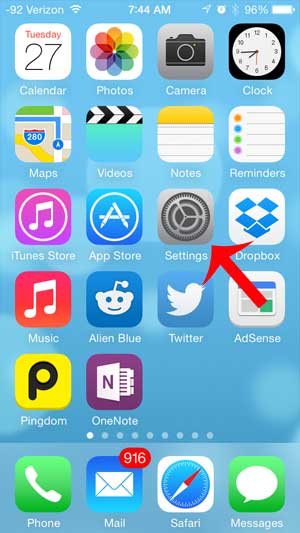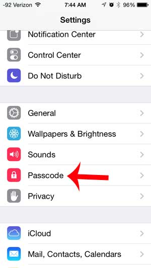 As etapas abaixo foram realizadas em um iPhone usando o sistema operacional iOS 7.1. Se você não vê oSenhaopção na Etapa 2, então você pode estar usando uma versão diferente do iOS. Se sim, você pode encontrar oBloqueio por senhamenu em Sconfigurações > Geralem vez de.