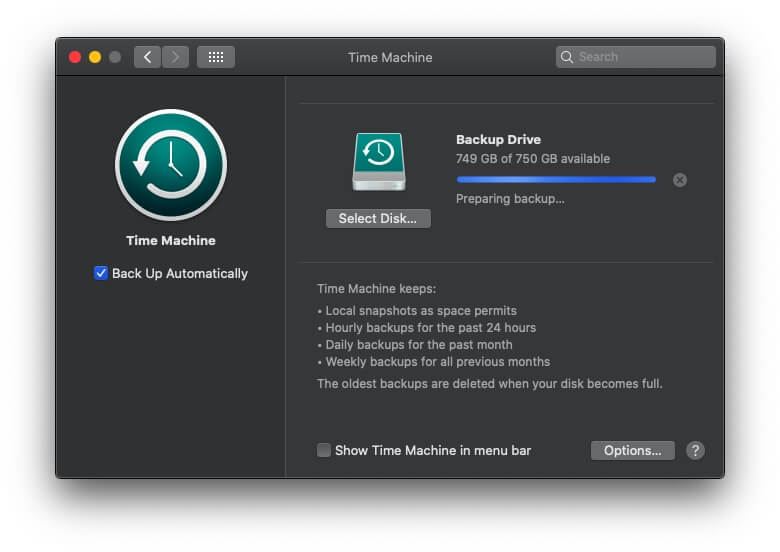 Decidi permanecer com a configuração padrão e deixar o backup iniciar automaticamente. O Time Machine começou preparando o backup inicial, que demorou cerca de dois minutos na minha máquina.
