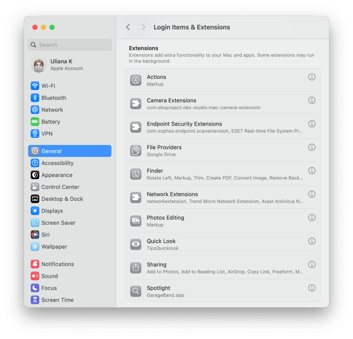 - Vá para o menu principal da Apple > Configurações do Sistema > Geral > Itens e Extensões de Login.