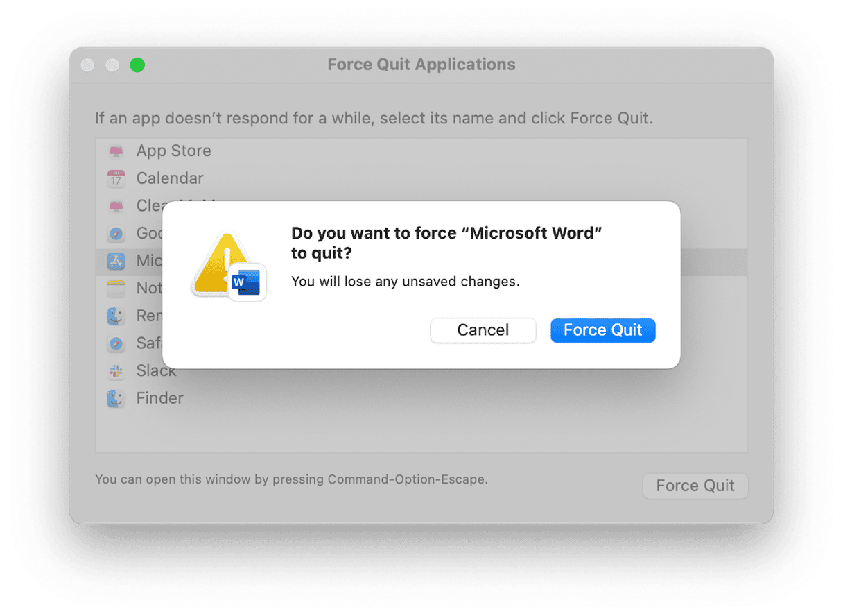- Pressione Command+Option+Escape, selecione Word e clique em Forçar Encerramento.