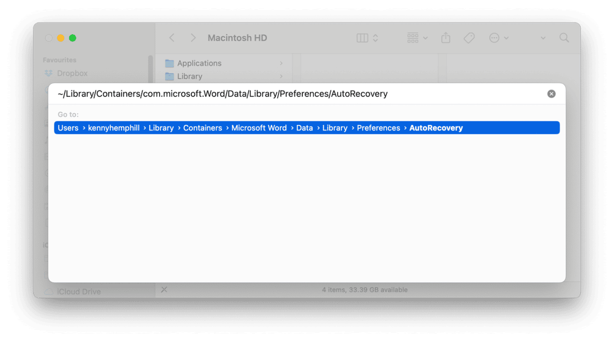 - Na caixa de texto, cole este caminho e pressione Return: ~/Library/Containers/com.microsoft.Word/Data/Library/Preferences/AutoRecovery