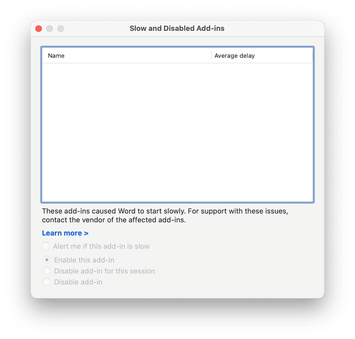 - No Word, se puder, clique no menu Ferramentas e escolha Suplementos lentos e desabilitados. Selecione cada um dos suplementos um por um e selecione Desativar. Reinicie o Word.