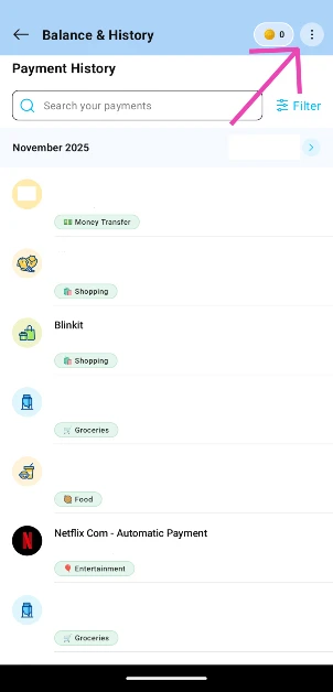 Para encontrar suas transações ocultas, vá para a seção ‘Saldo e Histórico’, clique nas reticências e selecione ‘Ver Pagamentos Ocultos’.