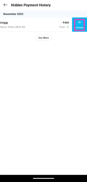 Sim, você pode ocultar transações Paytm deslizando para a esquerda e selecionando ‘Ocultar’.