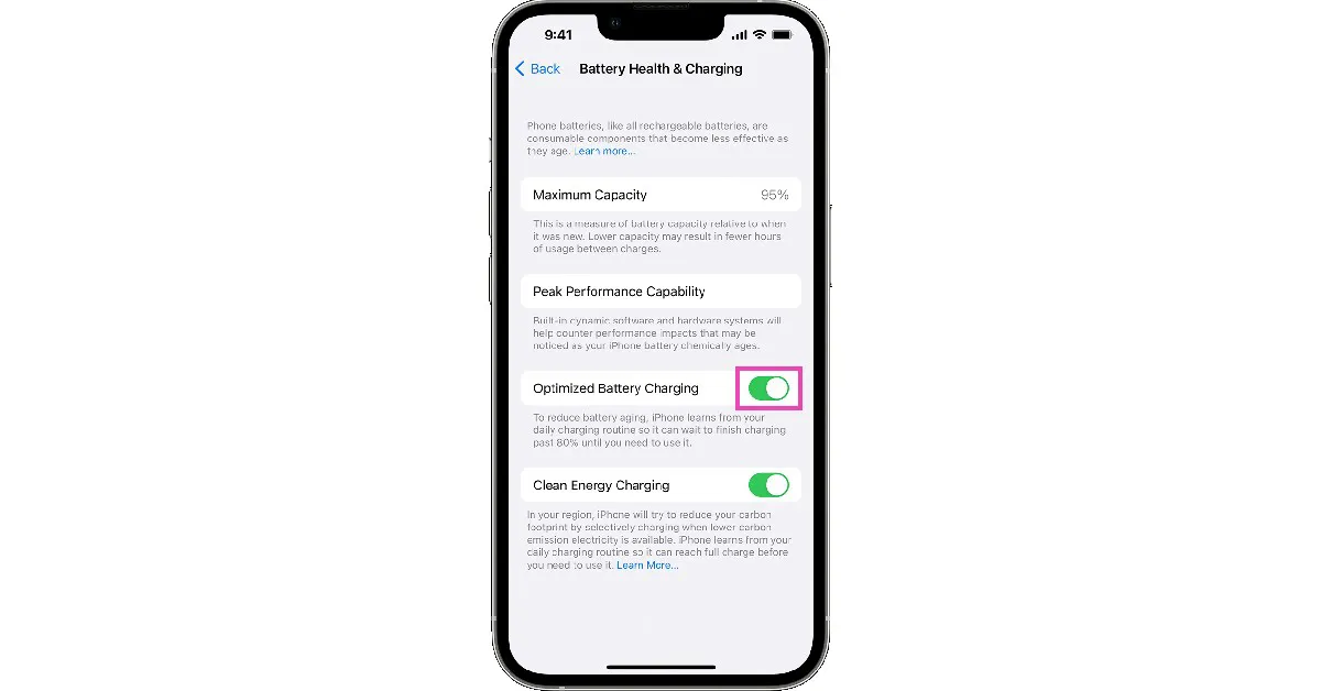A corrente excessiva que entra na bateria do seu telefone pode danificar permanentemente as células. Se você deixar seu telefone carregando durante a noite, isso prejudicará a saúde da bateria. O iPhone tem um ótimo recurso chamado ‘Carregamento de bateria otimizado’ para pessoas que carregam o telefone durante a noite. Você pode encontrá-lo acessandoConfigurações>Bateria>Saúde e carregamento da bateria. Assim que o carregamento otimizado da bateria estiver ativado, seu iPhone observará seus padrões de carregamento. Se você carregar o telefone durante a noite e desconectá-lo assim que acordar, o iPhone carregará a bateria até 99% na velocidade normal e, em seguida, carregará lentamente o 1% restante até você acordar. Isso evita que corrente excessiva flua para a bateria.