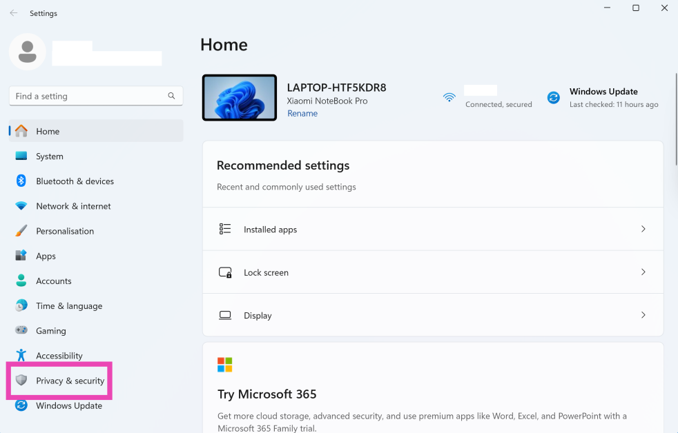 Etapa 1:Vá paraConfiguraçõese selecionePrivacidade e segurançada barra lateral.