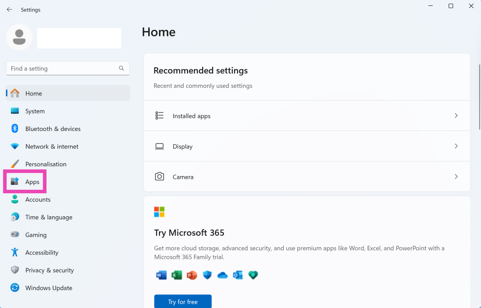 Etapa 1:Vá paraConfiguraçõese selecioneAplicativosda barra lateral.