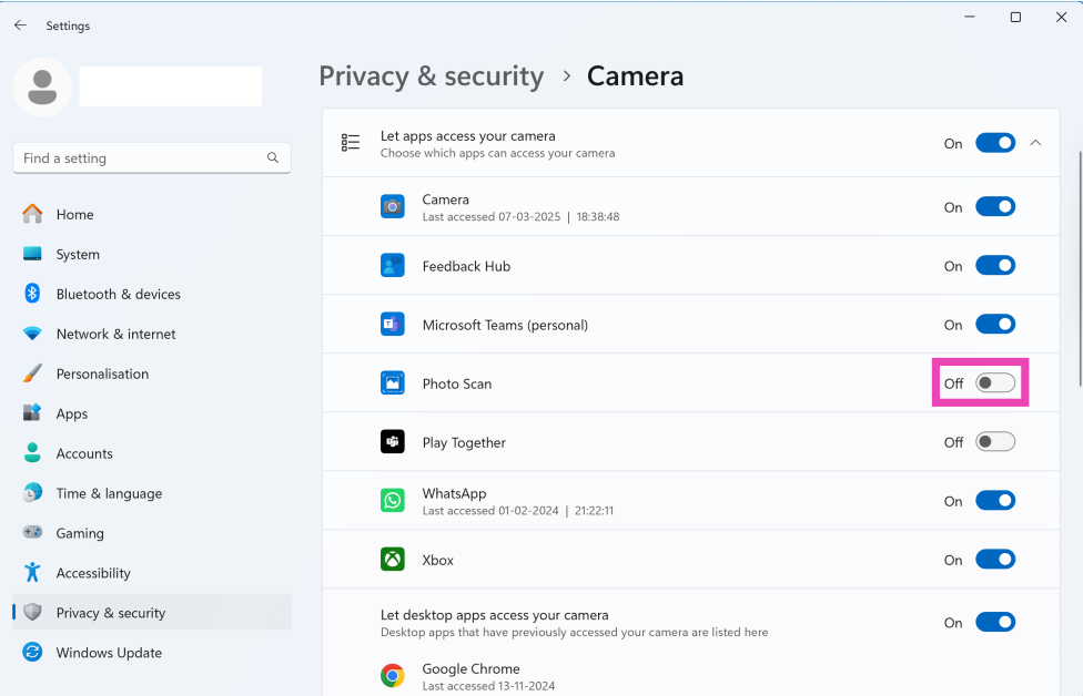 A câmera do seu laptop está ativada por padrão. No entanto, você precisa conceder acesso à câmera a aplicativos como Google Meet e Zoom para usá-lo. Vá paraConfigurações>Privacidade e segurança>Câmerae ative o botão de alternância ao lado do aplicativo ao qual deseja permitir o acesso à câmera.