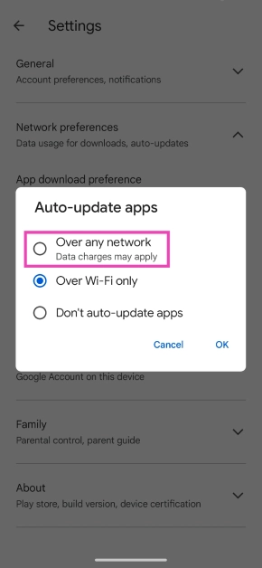 Vá paraGoogle Play Store>Configurações>Preferências de rede>Atualizar aplicativos automaticamentee selecione ‘Em qualquer rede’ ou ‘Somente em WiFi’, dependendo de sua preferência.