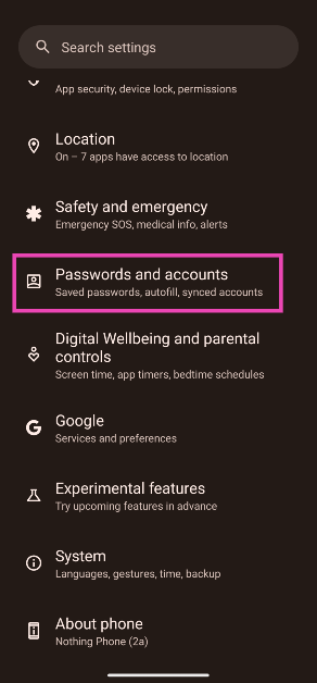 Etapa 1:Vá paraConfiguraçõese selecioneSenhas e contas.