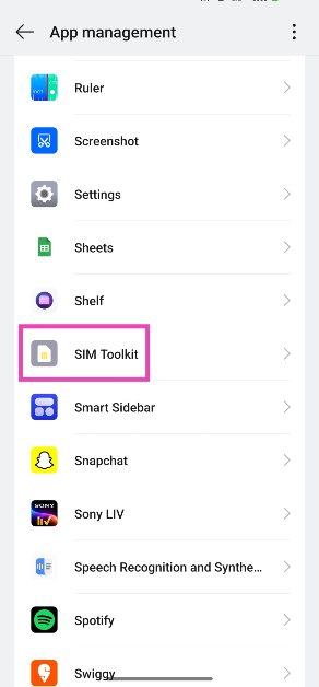 Etapa 3:Role para baixo e selecioneKit de ferramentas SIM. Se você não conseguir encontrar o SIM Toolkit, clique no botãoelipsesno canto superior direito da tela e selecioneMostrar aplicativos do sistema.