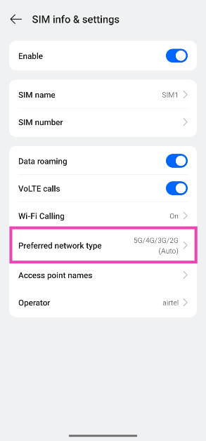 Vá paraConfigurações>Rede móvel, selecione um cartão SIM, toque em ‘Rede móvel preferida’ e selecione 4G na lista.