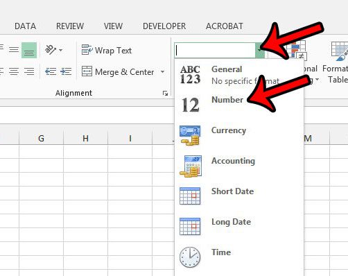 Etapa 2: verifique o menu suspenso na parte superior doNúmeroseção na faixa de opções. Se dizTextoe, em seguida, clique no menu suspenso e escolha oNúmeroopção.