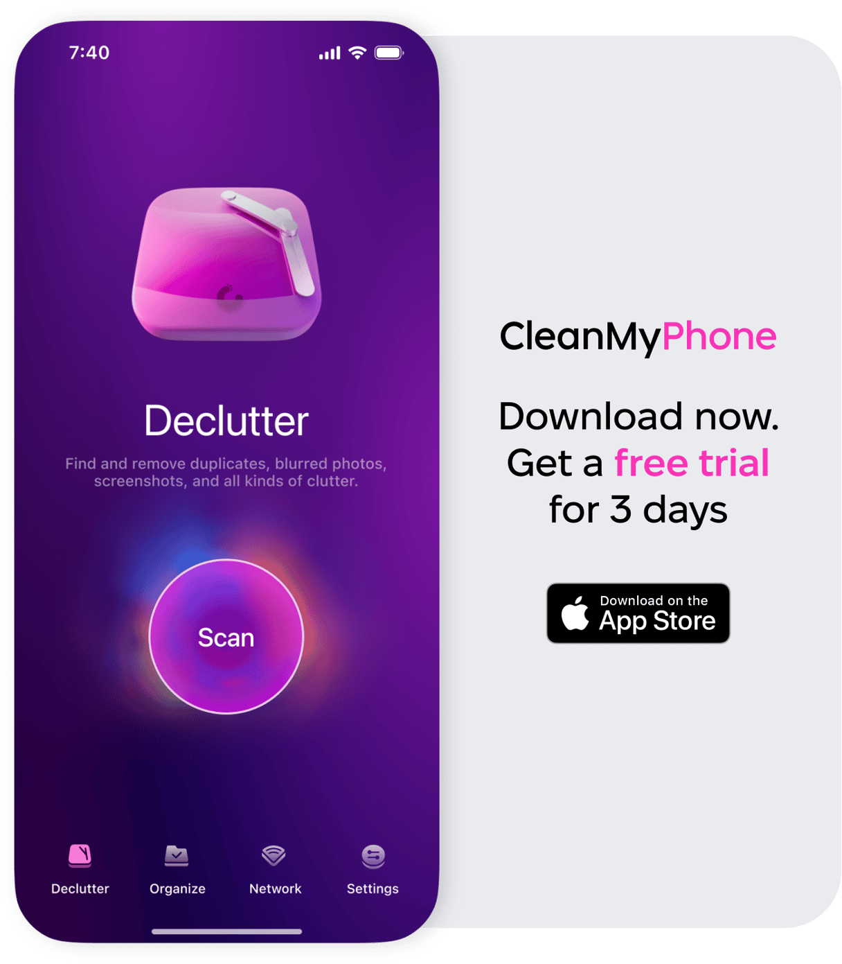 Parcurgerea și editarea videoclipurilor dvs. poate dura mult timp, mai ales dacă aveți zeci de videoclipuri pe iPhone. Acordați-vă timp pentru a vă dezordine iPhone-ul. Cu CleanMy®Phone, puteți curăța rapid spațiu pe dispozitiv. Îți scanează iPhone-ul și împarte dezordinea în categorii, inclusiv fotografii duplicate, capturi de ecran și înregistrări de ecran, astfel încât să poți decide rapid ce vrei să păstrezi și de ce vrei să scapi.