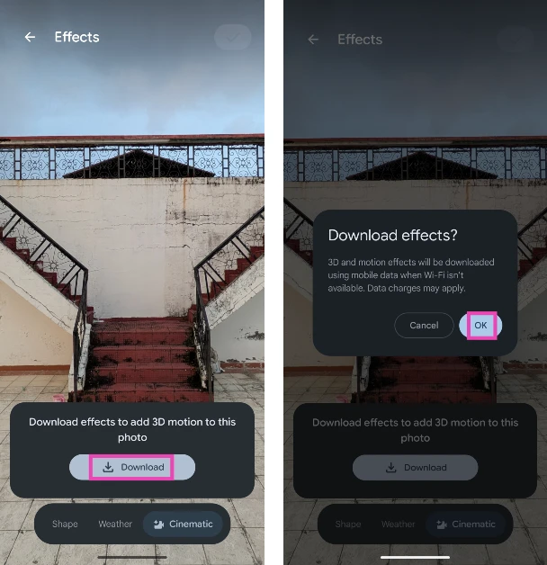 Pe Google Pixel, accesațiSetări>Tapet>Efecte>Cinematic, atingeți „Descărcați și activați comutatorul de lângă „Adăugați mișcare 3D la această fotografie”. ’