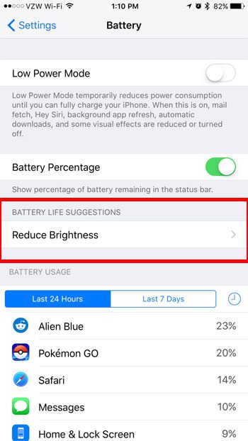 Pasul 3: LocalizațiSugestii pentru bateriisecțiunea din meniu. Dacă există ceva listat în acea secțiune, îl puteți atinge pentru a deschide meniul corespunzător. În imaginea de mai jos, de exemplu, îmi pot îmbunătăți durata de viață a bateriei reducând luminozitatea ecranului.