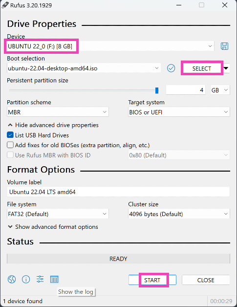 Pasul 2:LansațiRufusinstrument. Selectați unitatea USB înDispozitivcategorie.