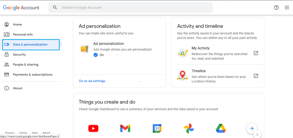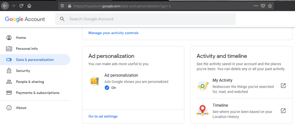 Pour plus de contrôles, vous pouvez accéder au « Mon activité"page de la"Données et personnalisationonglet ".