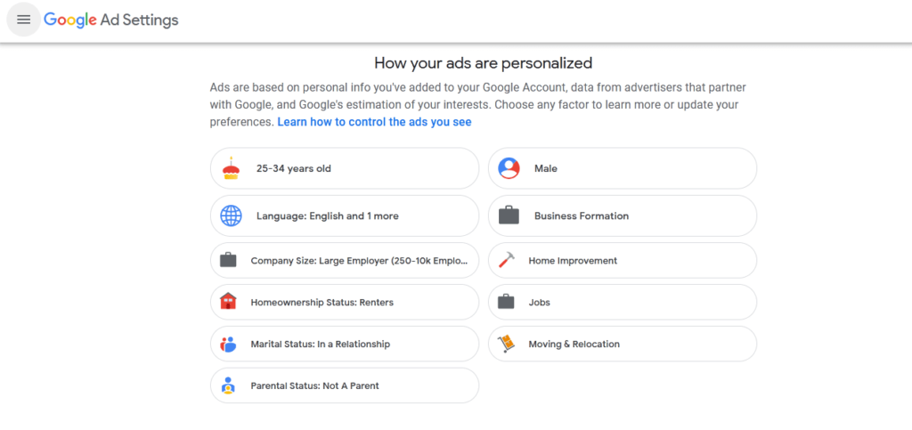 Pour créer un profil complet, Google doit collecter toutes les données que vous fournissez, de votre utilisation des réseaux sociaux à vos recherches et aux sites Web sur lesquels vous avez acheté des articles. L’entreprise a essayé d’être plus franche avec le type de données qu’elle fournit aux annonceurs, mais il est difficile de savoir ce qu’ils savent de vous.