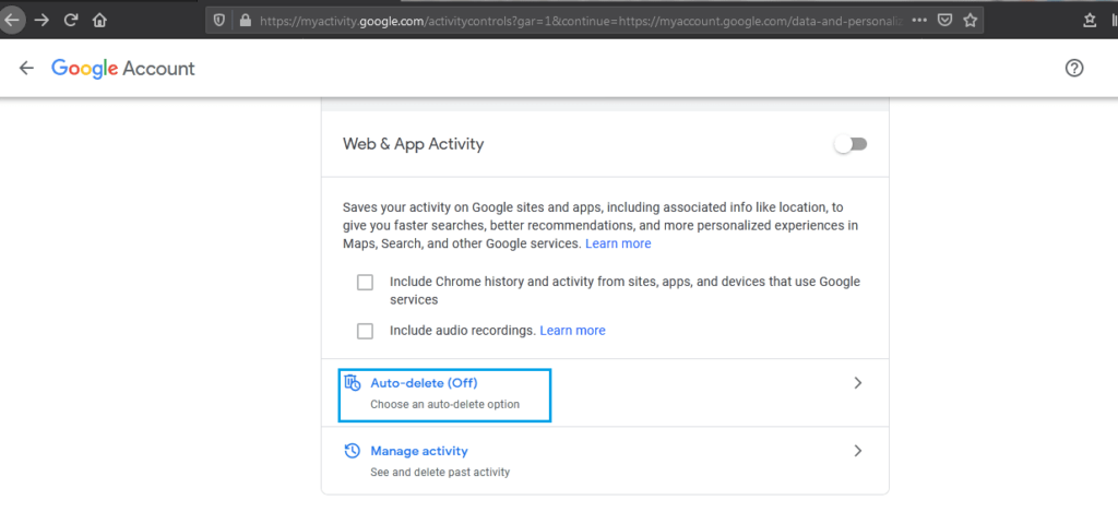 Du « Données et personnalisation", cliquez sur "Gérez vos contrôles d'activité.” Il vous emmène au "Contrôles d'activité" page, où vous trouverez le "Suppression automatique". Cliquez dessus et une fenêtre apparaîtra avec des options qui vous permettront de :