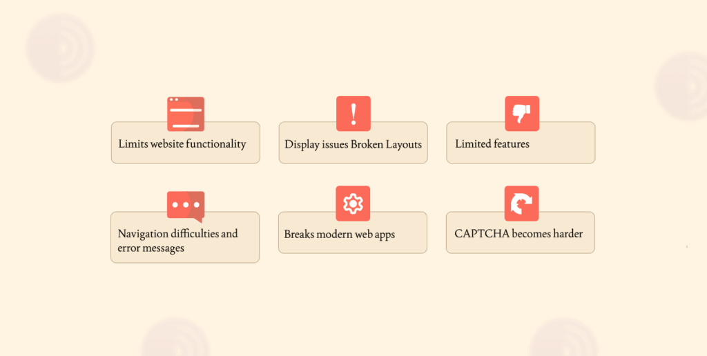- Fonctionnalités limitées: Vous pouvez être assuré que vous bénéficierez d’un accès limité à certaines fonctionnalités. Par exemple, des éléments tels que les menus déroulants, les lecteurs multimédias et les formulaires peuvent ne pas fonctionner correctement.
