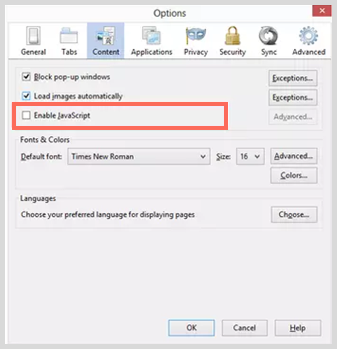 - Passez au « Contenu» et décochez la section «Activer JavaScript.”