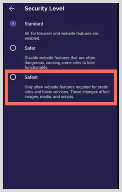 Remarque : il s'agit d'un paramètre global dans Onion Browser. Contrairement au navigateur Tor de bureau, vous ne pouvez pas définir d'exceptions par site ni choisir différents niveaux de sécurité. C'est tout ou rien.