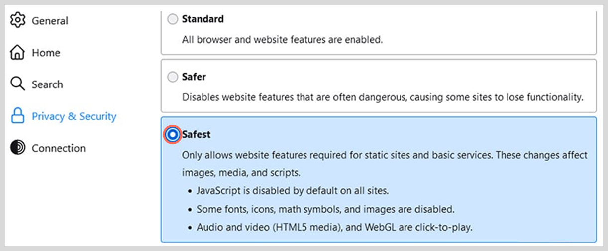 - Depuisles trois options (Standard, Plus sûr et Le plus sûr), sélectionnez «Le plus sûr.”