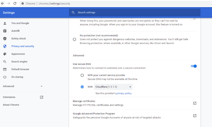 Paramètres (trois points verticaux en haut à droite de votre navigateur) >Paramètres>Confidentialité et sécurité>Sécurité>Utiliser un DNS sécurisé(faites défiler vers le bas pour voir cette option dans le 'Avancé') > Cochez 'Avec' et choisissez le service DNS souhaité.