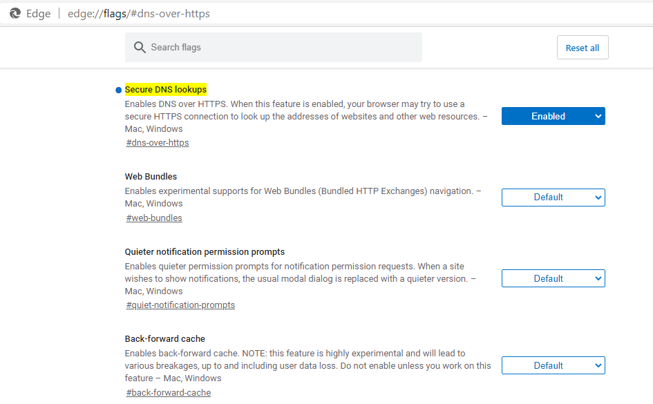Microsoft Edge propose également des paramètres de protection similaires à ses utilisateurs. Cependant, les paramètres ne sont pas visibles publiquement dans le menu des paramètres.