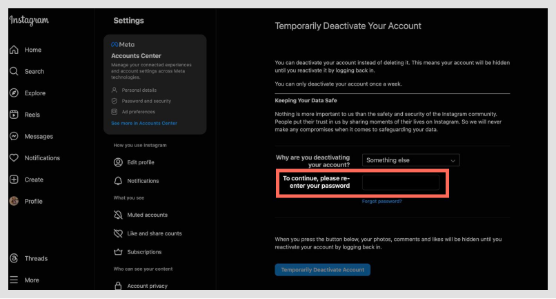 La principale caractéristique de la désactivation est qu’elle est temporaire. Pendant que votre compte est désactivé, toutes les informations de votre compte (profil, photos, abonnés, likes et commentaires) resteront cachées aux autres utilisateurs. Tout restaurer à la normale est aussi simple que de vous reconnecter à Instagram et de reprendre votre utilisation habituelle.