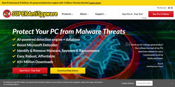 Il prend en charge Windows 8 et 10. Certaines des fonctionnalités étendues clés de SUPERAntiSpyware incluent :