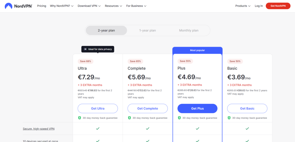 De plus, NordVPN propose plusieurs plans d’abonnement. Le plan est divisé en trois catégories : Standard, Plus et Complet.