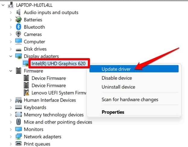 - Cliquez avec le bouton droit sur le nom du périphérique et sélectionnez Mettre à jour le pilote dans le menu contextuel.