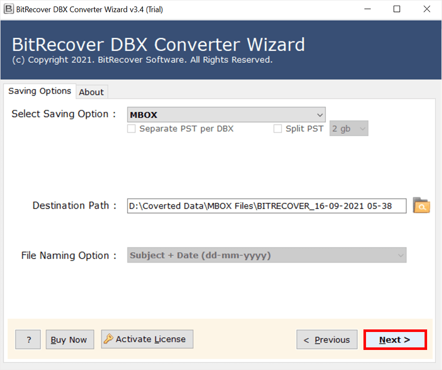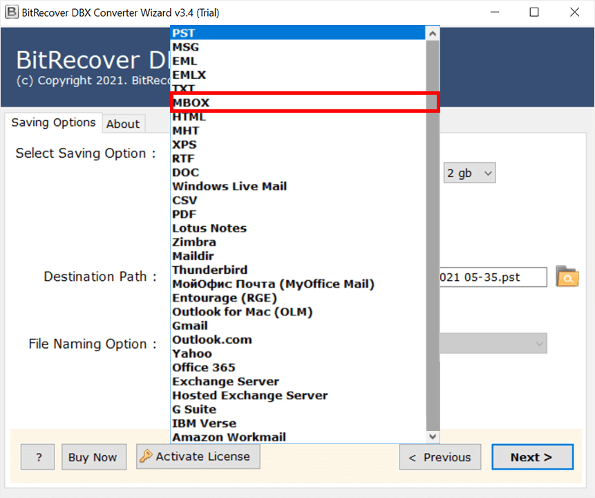 - Ensuite, cliquez sur le «Sélectionnez l'option d'enregistrement» et choisissez le «MBOX" option.