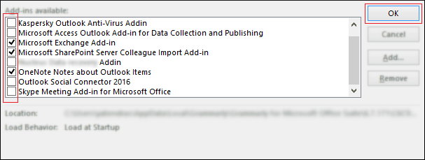 6. Décochez les compléments défectueux et rouvrez Outlook.