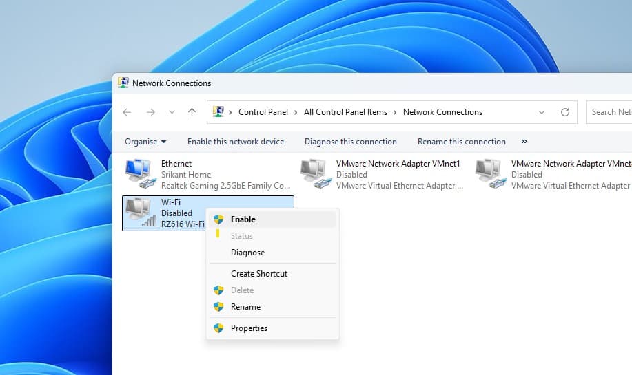 Encore une fois, un adaptateur Wi-Fi inactif est une raison courante qui empêche les options Wi-Fi de Windows 11 de s'afficher.