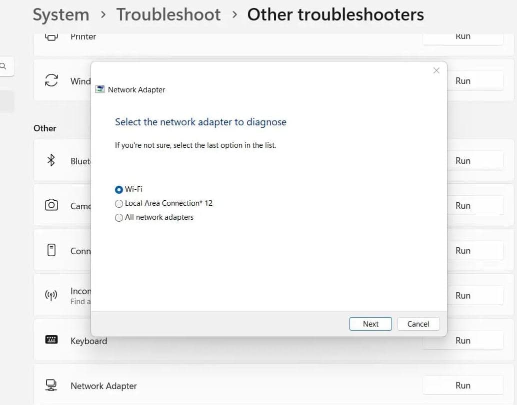 - Recherchez l'adaptateur réseau et cliquez sur Exécuter.