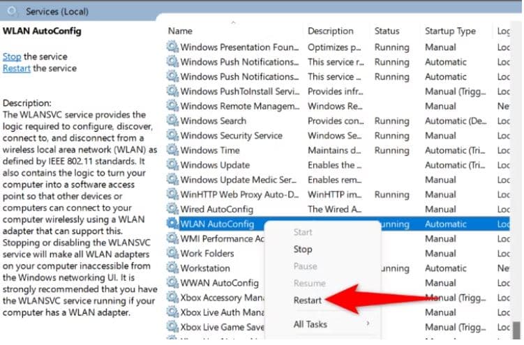 - Faites défiler la liste des services, cliquez avec le bouton droit sur WLAN AutoConfig et sélectionnez Redémarrer. Si l'option apparaît grisée, choisissez Démarrer.