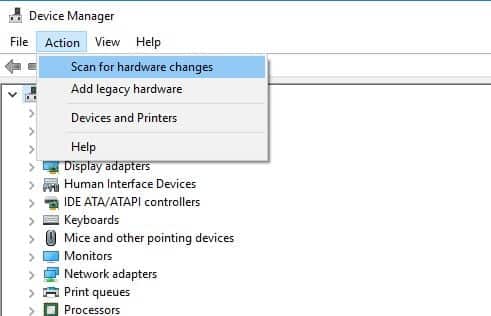 Sinon, ouvrez à nouveau le Gestionnaire de périphériques, cliquez sur ActionRechercher les modifications matérielles,et vérifiez si le problème est résolu ou non.