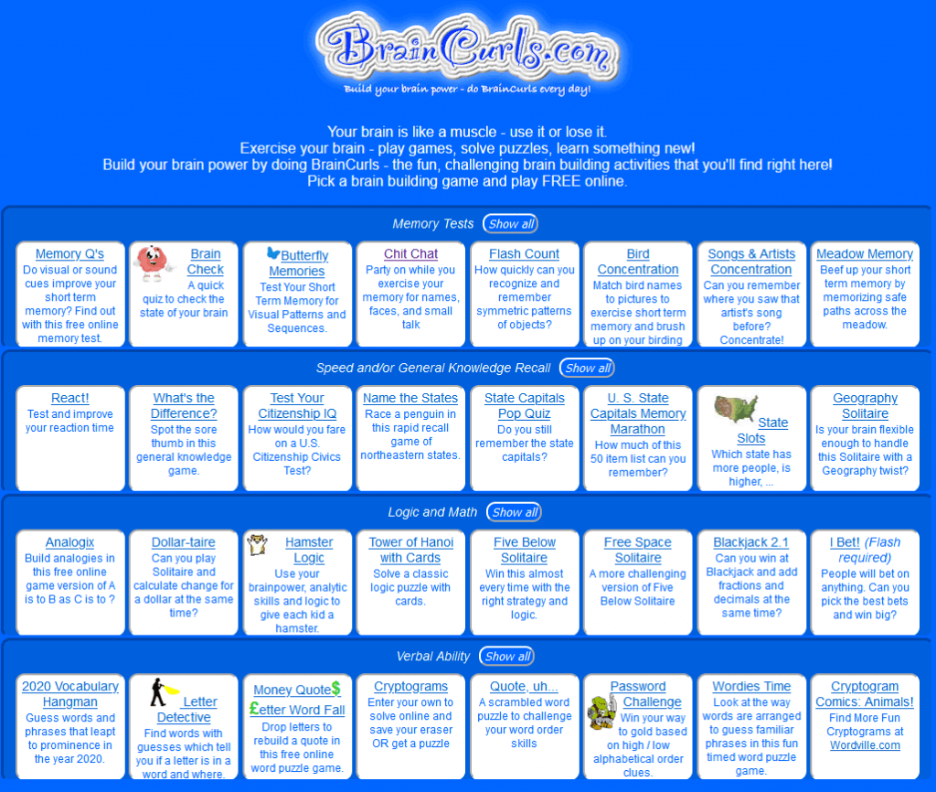 BrainCurls est un site Web proposant une grande variété de jeux différents conçus pour faire travailler votre cerveau. Ce site Web propose de tout, des jeux de mémoire aux jeux de mots, en passant par diverses énigmes et des questions logiques. Le site Web propose même un jeu de bavardage qui vous aidera à entraîner la reconnaissance faciale et la mémoire qui pourront vous aider dans vos futures interactions sociales.