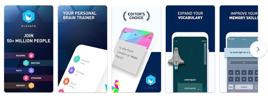 Elevate est une autre application qui vise à améliorer les compétences cognitives essentielles des personnes âgées. Cependant, cette application n'a pas de limite d'âge et tout le monde peut l'utiliser pour améliorer sa productivité professionnelle, ses capacités d'apprentissage, son acuité mentale, son vocabulaire et son agilité mentale.