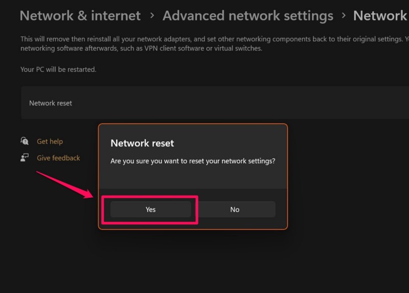 - Lancez l'application Paramètres > Réseau et Internet > Paramètres réseau avancés > Réinitialisation du réseau.