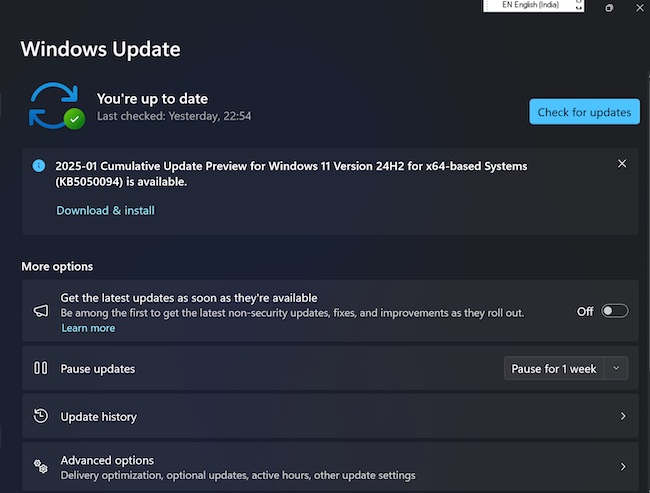 - Cliquez sur l'option Rechercher les mises à jour et installez toutes les mises à jour en attente.