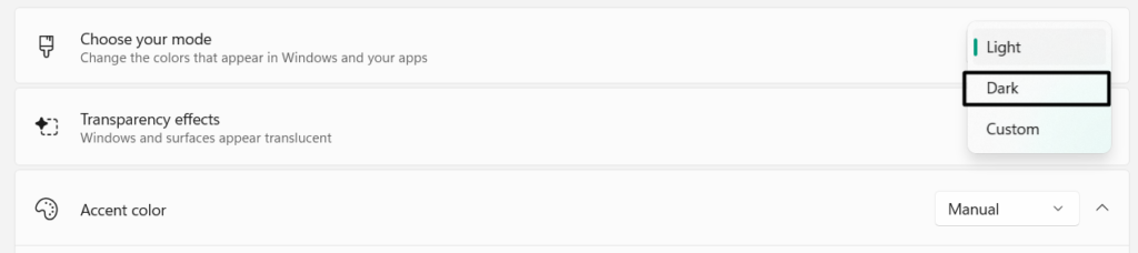 3.De laChoisissez votre modemenu déroulant, choisissez leSombrepossibilité de changer de mode.