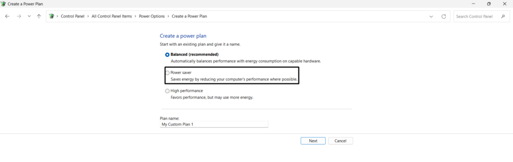 3.Dans leNom du forfait :Dans le champ de texte, saisissez le nom du nouveau plan d'alimentation et sélectionnezÉconomiseur d'énergie.