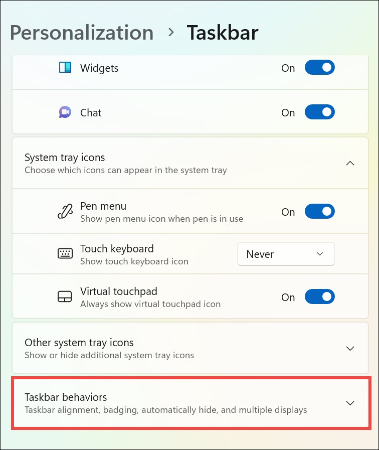 2.Dans lePersonnalisationfenêtre, choisissezBarre des tâcheset développerAutres icônes de la barre d'état système.