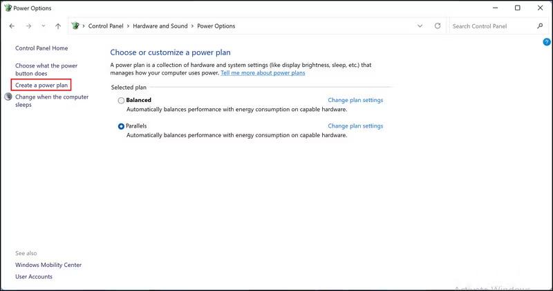 Étape 5 :Votre plan d’alimentation existant devrait être visible à ce stade. Dans le volet de gauche, sélectionnez Créer un plan d'alimentation.