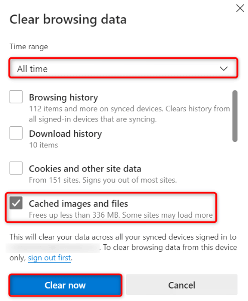 - ChoisirTout le tempsde laPlage de tempsmenu déroulant, activez l'optionImages et fichiers mis en cacheoption (décochez toutes les autres options) et sélectionnezEffacer les données.